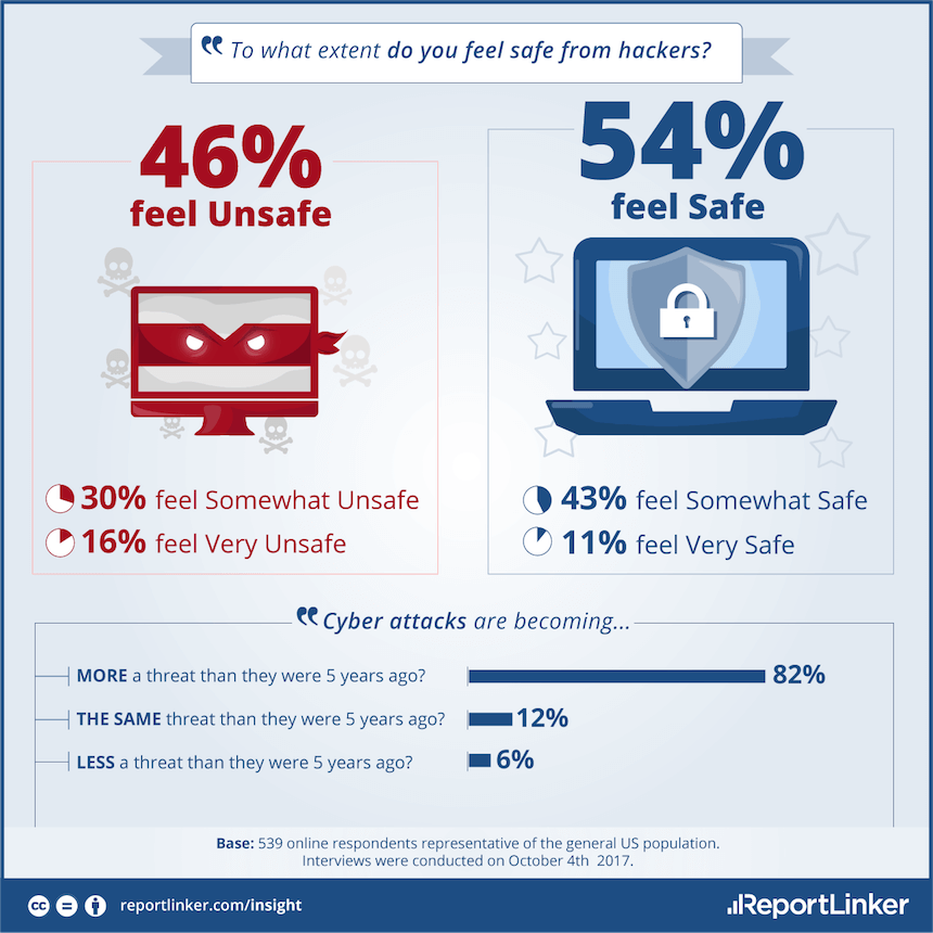 That’s why it’s so surprising to find these two passwords – for the fifth straight year – at the top of the list. But perhaps there’s an explanation: Many Americans don’t feel they personally are at much risk of a cyber attack. In a new ReportLinker survey on cybersecurity, 54% say they feel their data is safe from hackers, even as a large majority (82%) agree cyber attacks are more of a threat now than they were five years ago.