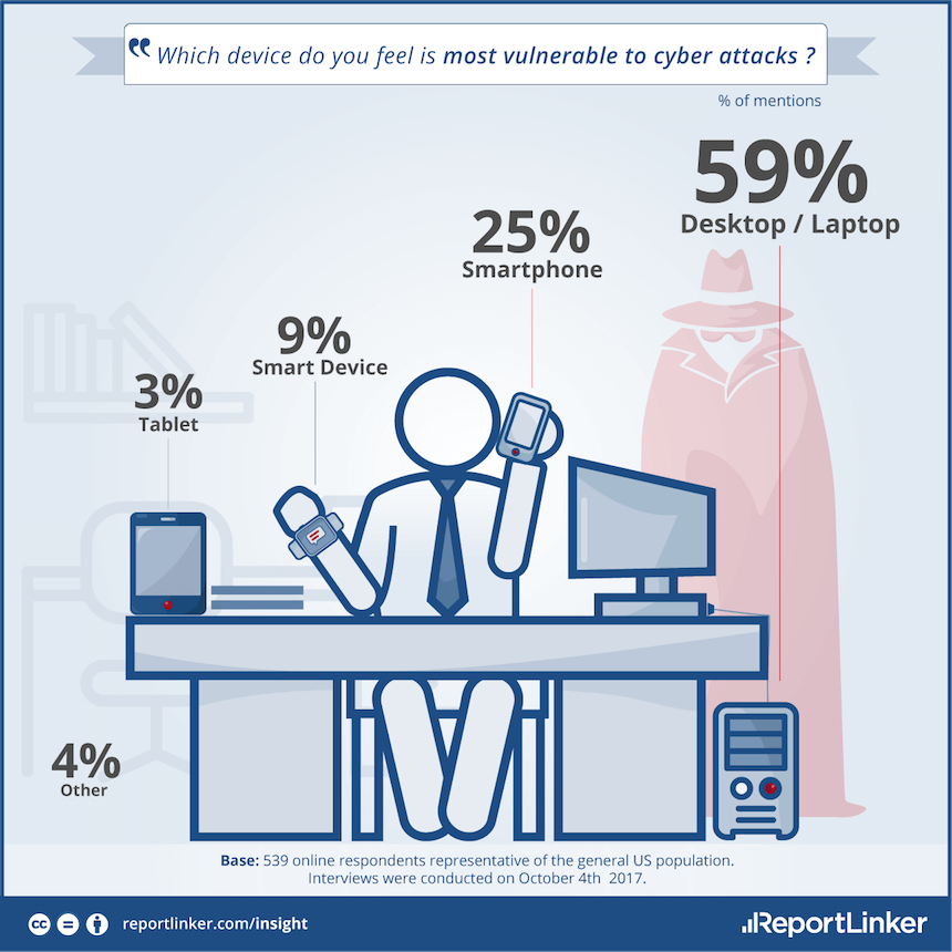 The US Federal Bureau of Investigation believes such attacks on IoT devices will continue. Yet, in ReportLinker’s survey, US respondents mentioned smart devices only 9% of the time as being most vulnerable to cyber attacks. Rather, respondents believe desktops/laptops (59% of mentions) and smartphones (25% of mentions) are more vulnerable.