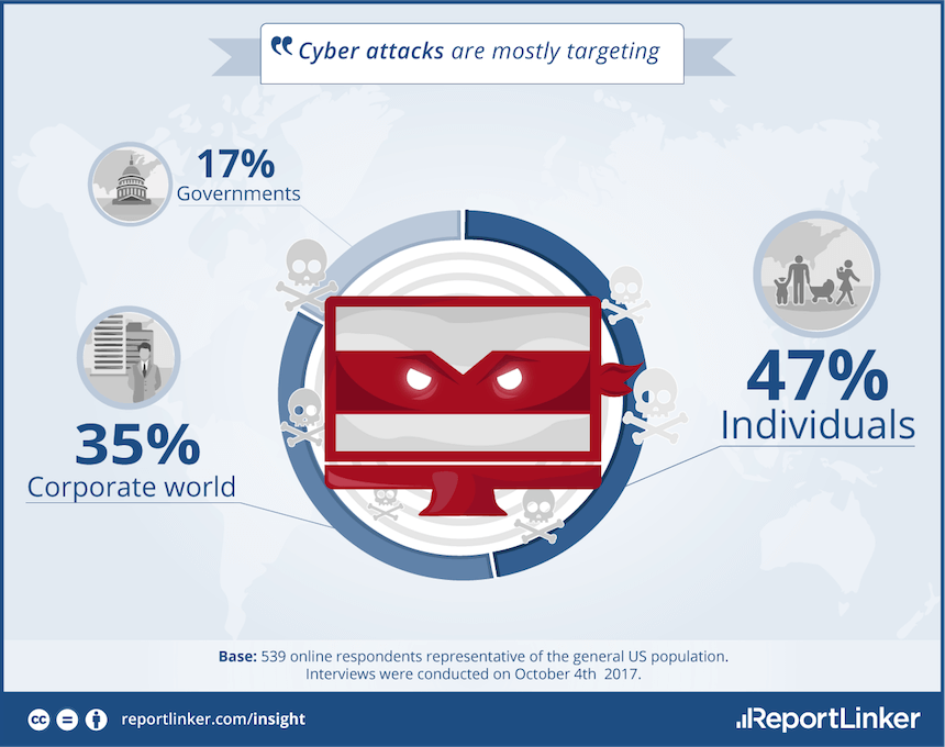 One reason Americans may feel somewhat less threatened by hackers is their perception of who is at risk. More than a third of survey respondents – 17% – believe hackers mostly target the government, while 35% believe corporations are the primary targets for hackers. For the majority (47%) individuals remain the most frequent target.