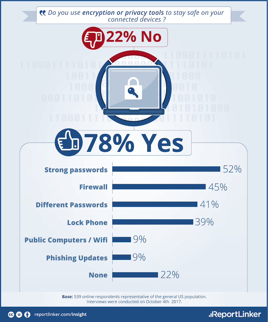 With more information in the cloud, however, privacy becomes a greater concern. Americans do take steps to protect their personal information from hackers and cyber attacks, but perhaps not enough. 78% of US respondents say they use encryption or privacy tools, while the rest say they don’t bother. That’s an important change (+12 pts) comparing to Reportlinker previous survey conducted in November 2016, that showed about two-thirds of Americans (66%) were using such tools.