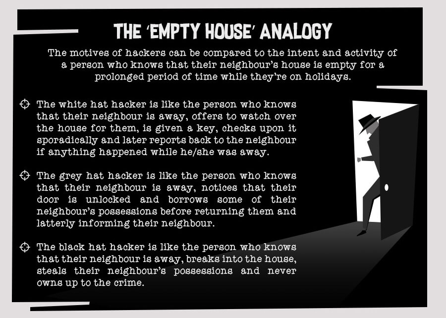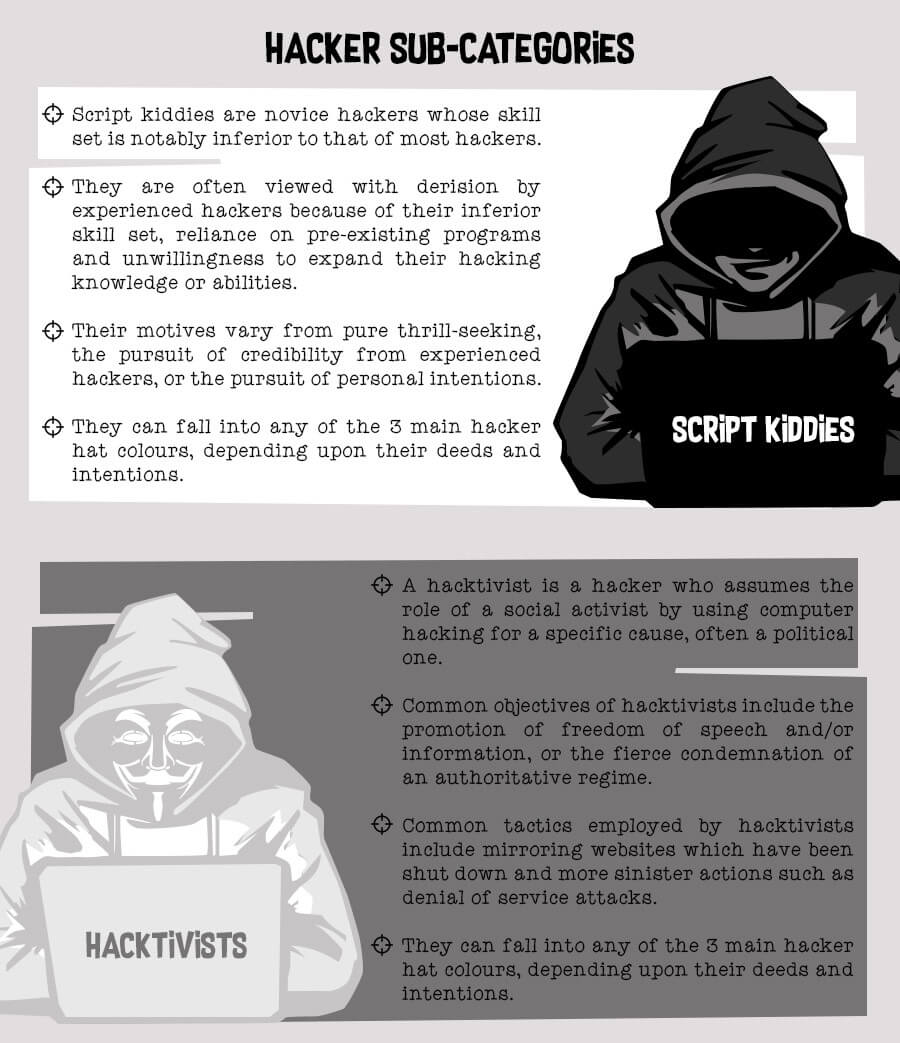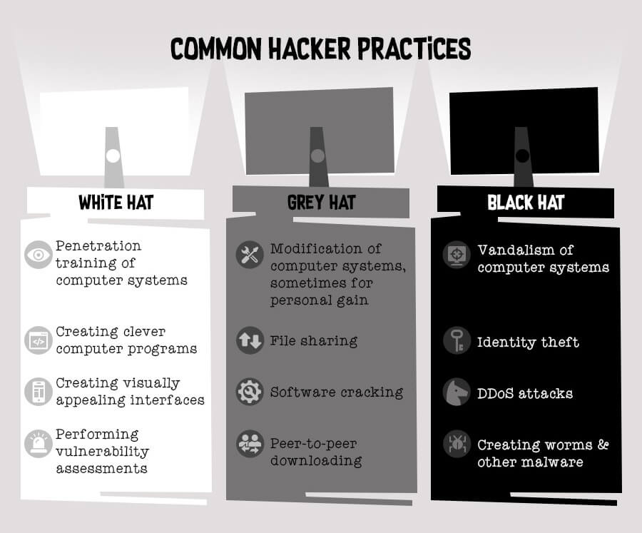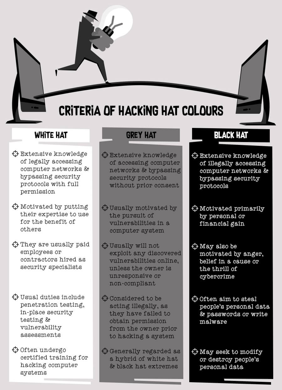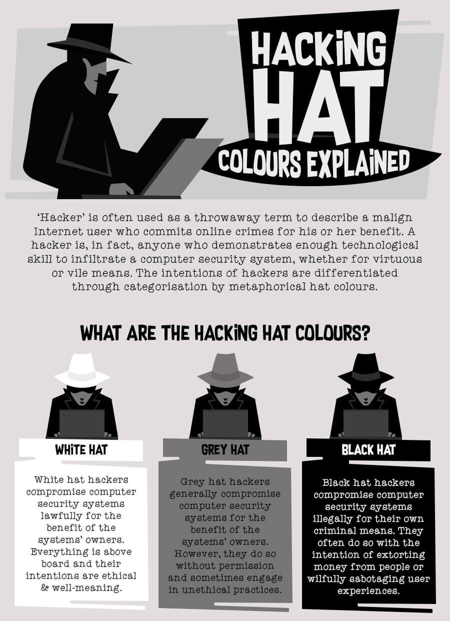 Hackers can be categorized into three groups as determined by their behavior, with each of these groups designated a metaphorical hat color. There’s white hat hackers who act within the law and who will never access a computer system without the owner’s prior consent. Grey hat hackers often act with a large degree of morality and rarely expose vulnerabilities for personal gain, but they don’t get the owner’s permission first and technically are breaking the law. Finally, the black hat hacker group consists of those who infiltrate computer systems to hold people to ransom or cause general chaos for computer users, sometimes on a worldwide scale.