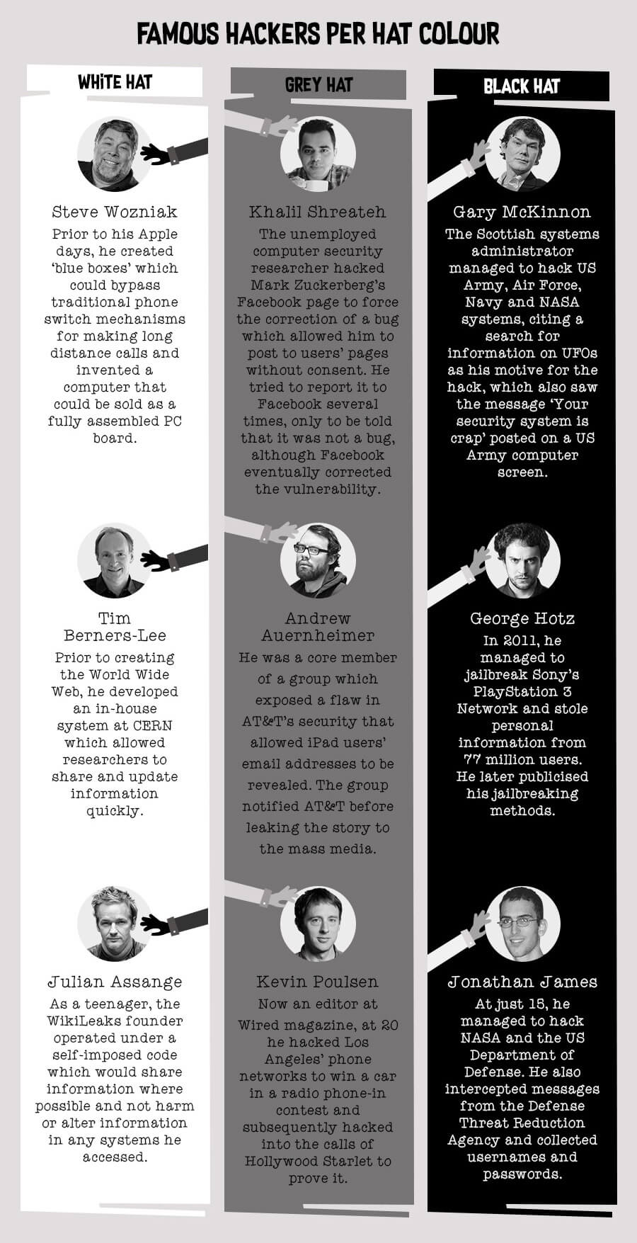 This infographic from Exigent Networks gives a neatly summarized beginners’ guide to the various hacking hat colors, outlining the most common activities of each category and citing famous (or infamous) examples of white, grey and black hat hackers.