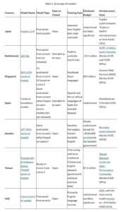 One of the most high-profile ways governments have advanced sovereign AI is by supporting the development of government-aligned generative AI models. Among others, as outlined in Table 1, the governments of Japanthe NetherlandsSingaporeSpainSwedenTaiwan, and the United Arab Emirates (UAE) are directly catalyzing the development of sovereign AI models.