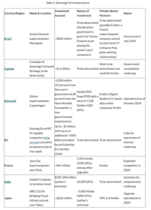 As with sovereign AI models, there are many examples of governments pursuing this AI compute investment strategy, including BrazilCanadaDenmark, the EUFranceIndia, and Japan—each one at different stages of executing their sovereign compute strategy, as outlined in Table 2.